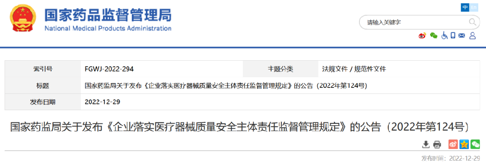 2023-02-102022年12月29日,國家藥品監督管理局發布《企業落實醫療器械質量安全主體責任...